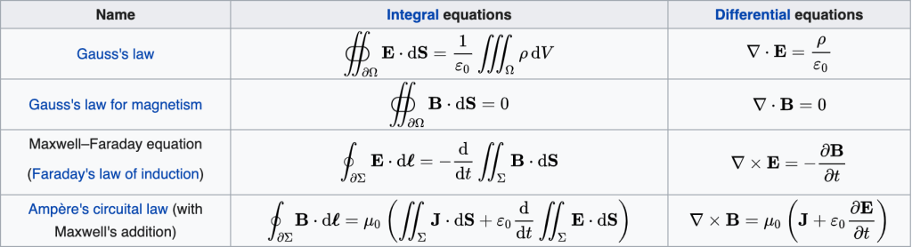 Just like the gravitational force due to any object with mass can be described by the object’s gravitational field, the electromagnetic force due to any object with electrical charge or magnetic moments can be described by the object’s electromagnetic fields. That’s a mouthful – but what I mean is that I can think of an electron (which possesses a negative electrical charge and has a magnetic moment) & the electromagnetic force in a similar way to how I think of Earth & gravitational forces. Classically, the equations that govern electromagnetic fields are Maxwell’s equations. There are four of them and they all come in two forms (integral and differential):
