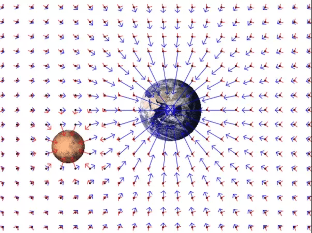 One difference between Gravity and Electromagnetism is that at a classical (“zoomed out”, large-scale) level, there appears to be two distinct E&M fields rather than just one field (like the gravitational field). These two fields are are the electric field and the magnetic field. Unlike the electric field, there is no evidence of “magnetic charge” – just something we call a “magnetic moment” like I specified before. Later on in the E&M story is when you learn that these two fields are actually byproducts of the same “parent” field tensor. Although, even at a classical level we are able to see a relationship between the two fields (which is described in Maxwell’s equations). One thing we know about classical E&M is that when one of the fields change (electric or magnetic) it has an effect on the other. A “changing field” usually means something with electrical charge or magnetic moment (ie. an electron) is moving. For instance, if the Earth suddenly moved to the other side of the solar system and you stayed put, then the gravitational field would have changed where you are and you wouldn’t feel the Earth pulling you towards it as strongly (actually, you wouldn’t notice anything pulling on you at all, except for the sun keeping you in its orbit). An electron (or any other charged particle) moving away from you will lead to a change in the electric & magnetic fields where you stand. For the purposes of this blog, what you should know is the following: