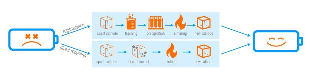 When comparing the two methods (regeneration vs. recycling), there are many pros and cons. Cathode regeneration is a more scalable process – although requires more complex syntheses and generates more waste and pollution; whereas, recycling through the re-lithiation of cell cathodes can handle materials with higher degradation level but requires more rigorous sorting and pre-processing of cell materials.