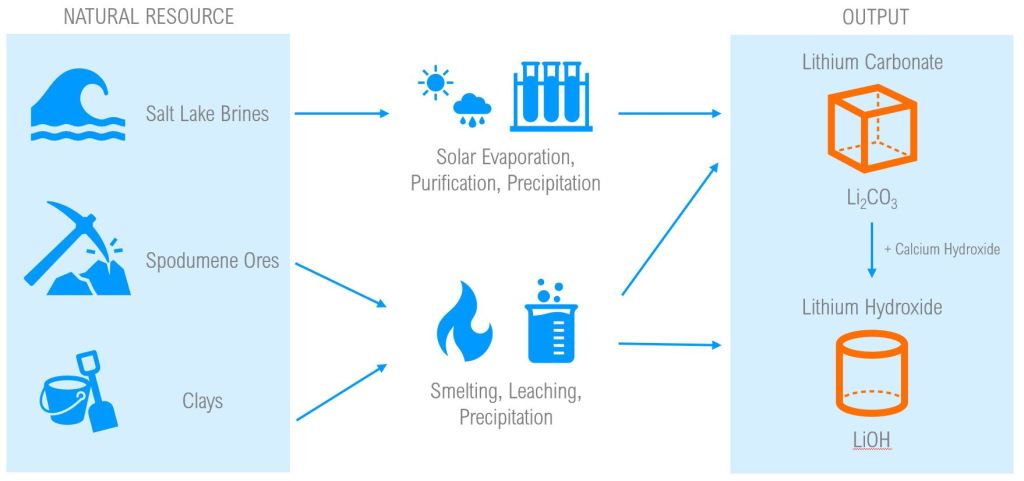 The primary products of lithium processing for battery manufacturing are Lithium Carbonate (Li2CO3) and Lithium Hydroxide (LiOH). While these two substances have varying chemical properties and economic value, both are used in the fabrication of Li-Ion batteries, alongside other minerals.