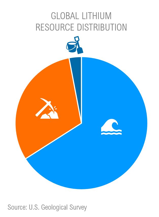 Most of the world’s identified lithium can be found in salt like Li-bearing brines – However, these brines contain low lithium concentrations relative to most naturally occurring hard-rock deposits (ie. spodumene ore deposits). In comparison to hard-rock mining, brine processing facilities generally require lower exploration costs, lower capital costs, and lower operating costs. Although, these brines possess very low lithium compared to other coexisting ions like sodium, potassium, calcium, and magnesium, which leads to challenges in lithium yield efficiencies when processing brine using traditional purification techniques like solvent extraction and precipitation. Better techniques to increase lithium yield in brine processing are still being developed and not yet industrialized.