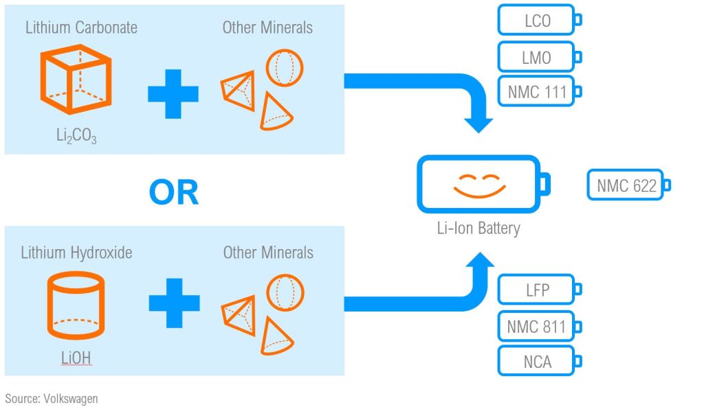 Not all li-ion batteries are the same, there are several li-ion subchemistries that are used in different applications. For instance, Lithium Cobalt Oxide (LCO) is most often used in personal electronic devices, whereas Lithium Nickel Manganese Cobalt Oxide (NMC) is the basis of the new Tesla 4680 battery. Generally, the differences in li-ion subchemistries primarily manifest within the cathode chemistry – an internal component to the li-ion cell. Some li-ion subchemistries require the use of Lithium Hydroxide, while others use Lithium Carbonate.
