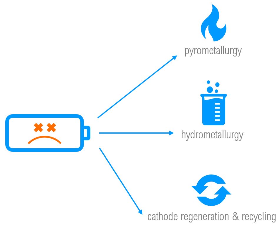 Regeneration of cathode materials is possible through combinations of pyrometallurgical & hydrometallurgical techniques. The conceptual benefit of regeneration is that rather than recovering bulk amounts of select materials through traditional recycling that are then sold back to manufacturers to be used in fabricating new products, regeneration aims to re-synthesize cell cathode materials all at once – keeping the circularity at the cell-level. This, however, eliminates the possibility of using recyclable cell materials in other applications – but reduces the number of steps in the li-ion recycling cycle. Disadvantages of current-day cathode regeneration techniques are that they require high level of input materials, intensive energy use, and generate high levels of waste and pollution (J.Mao et al. 2022). Additionally, only select cathode-types (NMC, LFP, LCO) have seen repeated success in laboratory settings. The feasibility of regeneration for other li-ion subchemistries has not been realized, and thus is far from industrialization. However, for LFP in particular, cathode regeneration could become a feasible method to recycle large amounts of spent cells in the future. Read more in the study by G. Ji et al. 2022: direct regeneration of degraded lithium-ion battery cathodes with a multifunctional organic lithium salt.