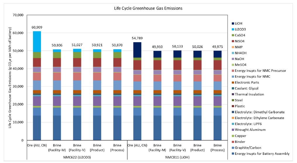 The amount of energy consumed and emissions involved in the development of a Li-ion cell depends on the type of resource (salt lake, spodumene ore, hectorite clay) the lithium was extracted from, and what type of cell is being made. Life cycle analyses performed by J. Kelly et al. (2021) discuss the difference in energy use, GHG emissions, and water consumption between the production of NMC811 and NMC622 cells. The study considers several facets of the process including lithium acquisition; lithium concentration; production of lithium chemicals, battery cathode powders, and batteries; and associated transportation activities along the supply chain. In this study, it was found that battery-grade lithium compounds produced from salt lake brines had less life cycle GHG emissions and freshwater consumption per tonne than if mined from ore-based resources. Also, cells produced from LiOH yield marginally lower GHG emissions than those fabricated from Li2CO3.
